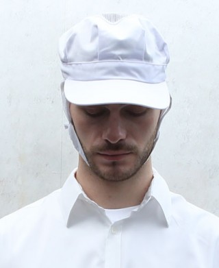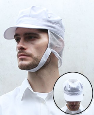 위망사 모자로 통기성이 좋으며 턱끈이 있어 이물질 방지에 도움을 줍니다.