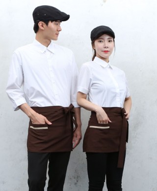 폴리100% 살짝 두꺼운 폴리원단을 사용하여 내구성이 좋으며 카페 주방또는 홀 등 잘 어울리는 곳에서 착용가능합니다.