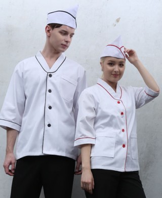 개량한복 스타일로 백색에 배색 띠로 포인트를 준 깔끔한 디장인입니다. 주방, 급식실, 식품회사, 마트,백화점 스낵코너 등에서 착용하시면 좋습니다.