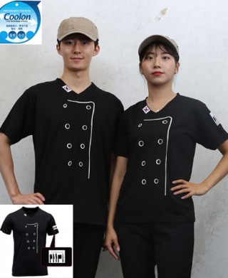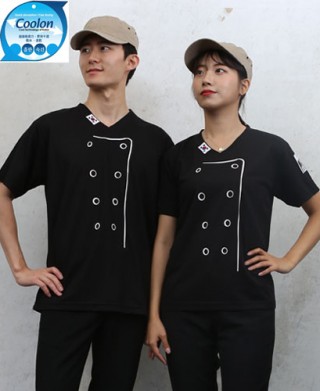 쿨론원단100% 로 앞쪽에 쿡모양과 팔쪽에 프로페셔널 인쇄가 되어있는 티셔츠 쿡복입니다. 더운여름철 티셔츠를 입지 못하는 더운매장에 잘 어울립니다.